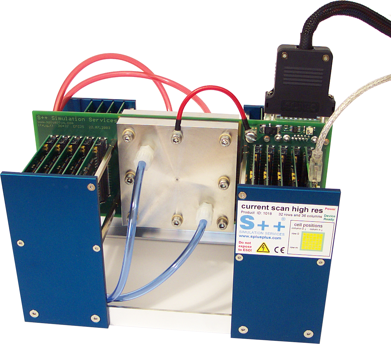 The available standard device has the same size as the 25cm² ECF 25 single cell fuel cell from Electro Chem. It has 32 x 36 segments of 1.47 x 1.64mm on a base plate. 18 boards with 64 electronic loads and a data-acquisition system with USB interface are pluged into the base plate. The power supply is in a 19" housing.
