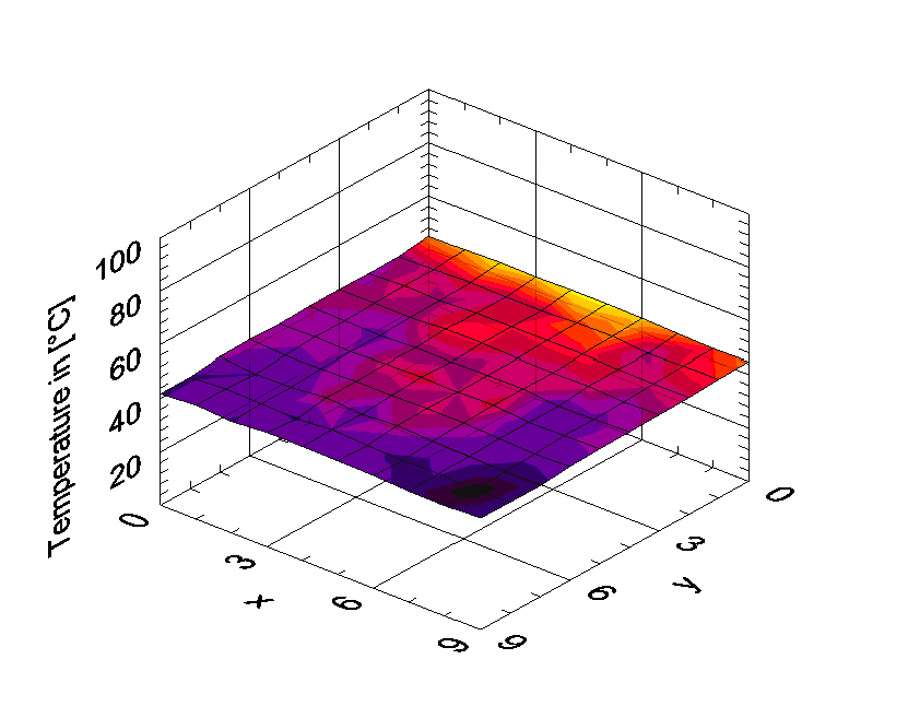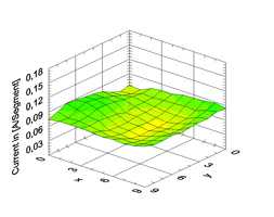 The device of type current scan lin shown befor has a resolution of 17 x 19 measurement cells and an active area of 150cm². It will be placed between the two halves of a bipolar plate at an arbitrary place in the stack. The pictures below show a typical current distribution and a temperature distribution.